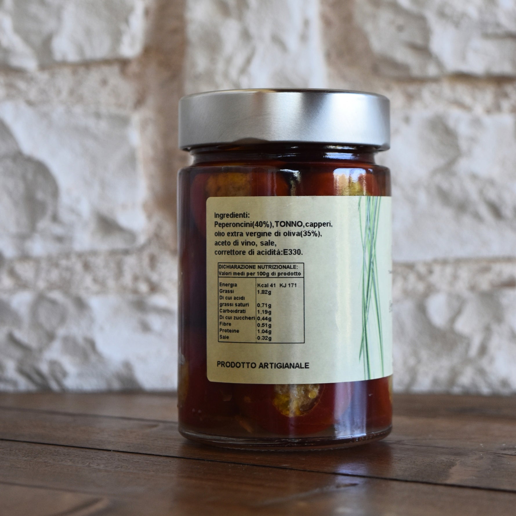 359 gr Peperoncini piccanti ripieni con tonno e capperi in olio extravergine d’oliva.