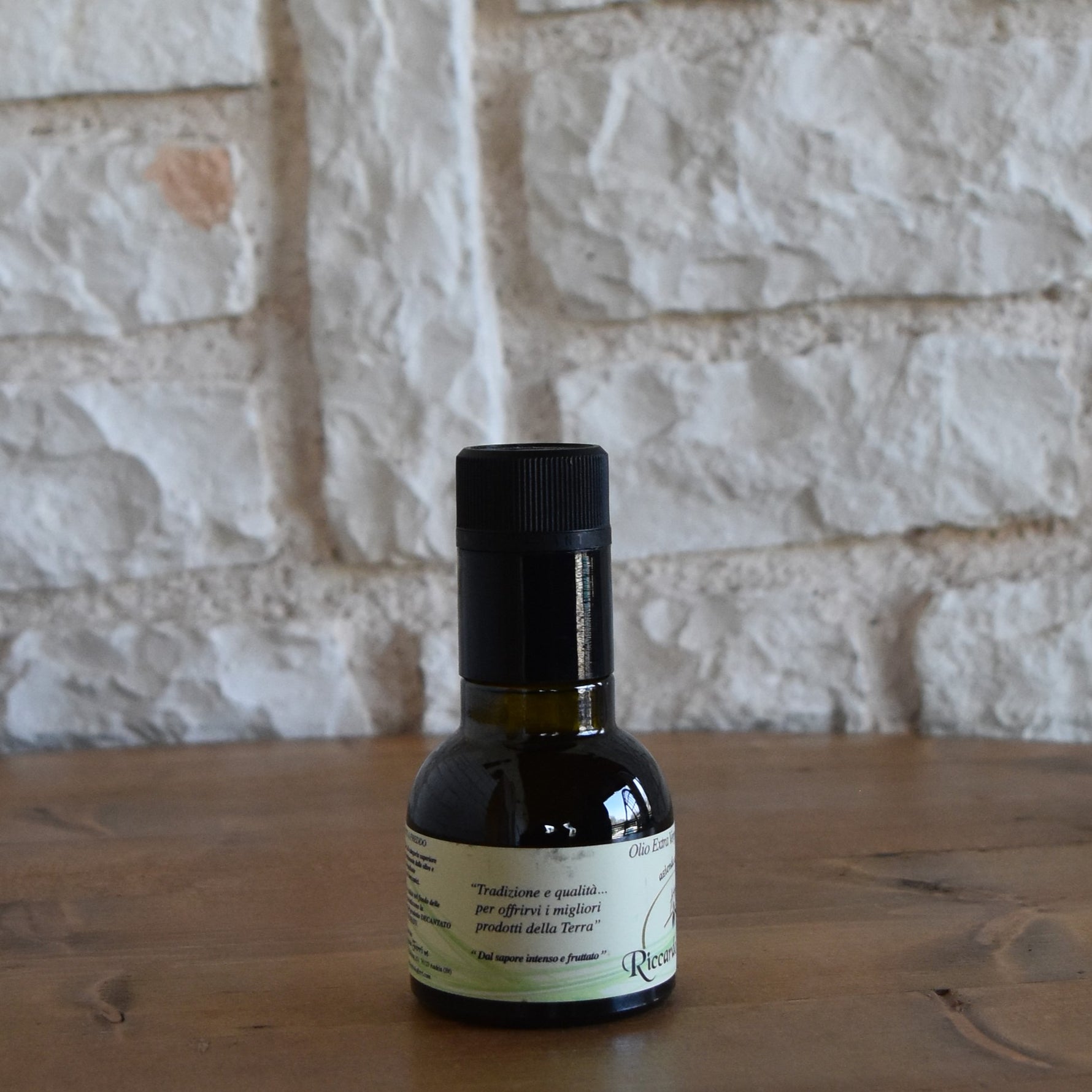 Bottiglia da 100 ml di olio extra vergine d’oliva estratto a freddo dal sapore intenso e fruttato.
